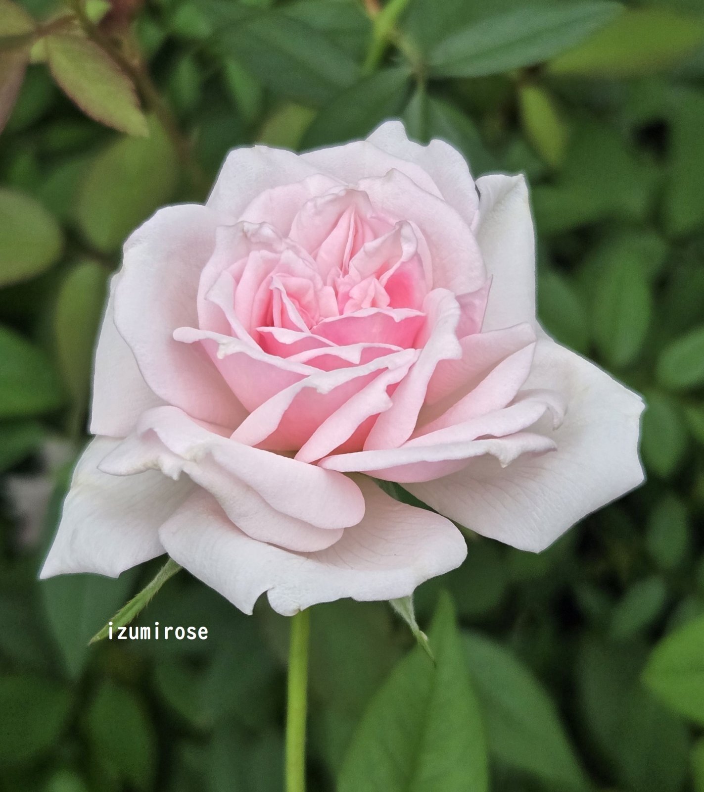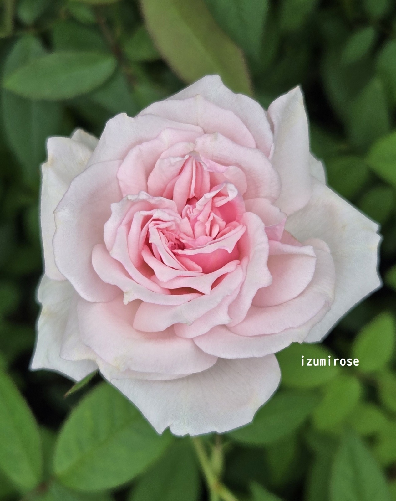 四季咲、淡いピンク、八重咲、花径5cmぐらい。